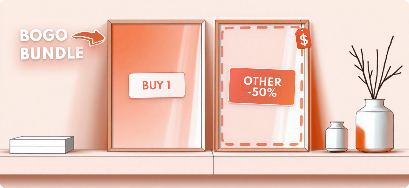 BOGO stands for "Buy One, Get One." This type of bundle typically prompts customers to purchase additional items to qualify for a discount or a bundle price. For example, buy 2 t-shirts, get 3rd for free, or get a sticker set for $3 when buying a hoodie.